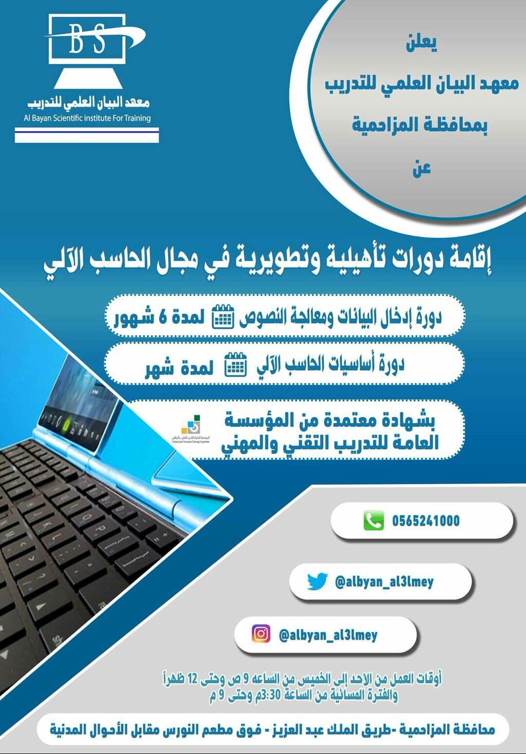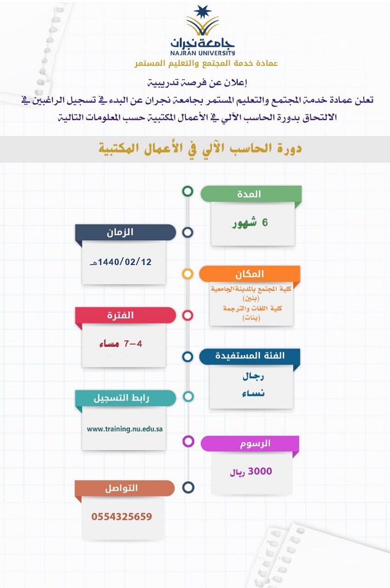 احصل على شهاده دورة حاسب الي معتمده. الاداري دورة استخدام الحاسب الالي في الاعمال المكتبية لمدة 3 شهور وذلك بشهادة معتمدة من المؤسسة العامة للتدريب التقني والمهني. ابغى دورة حاسب الي 6شهور.