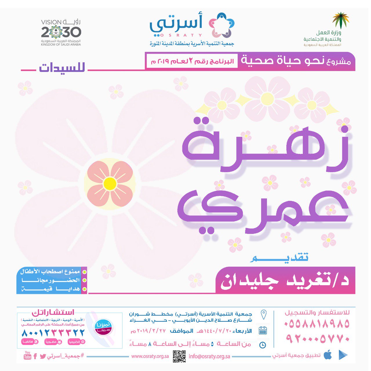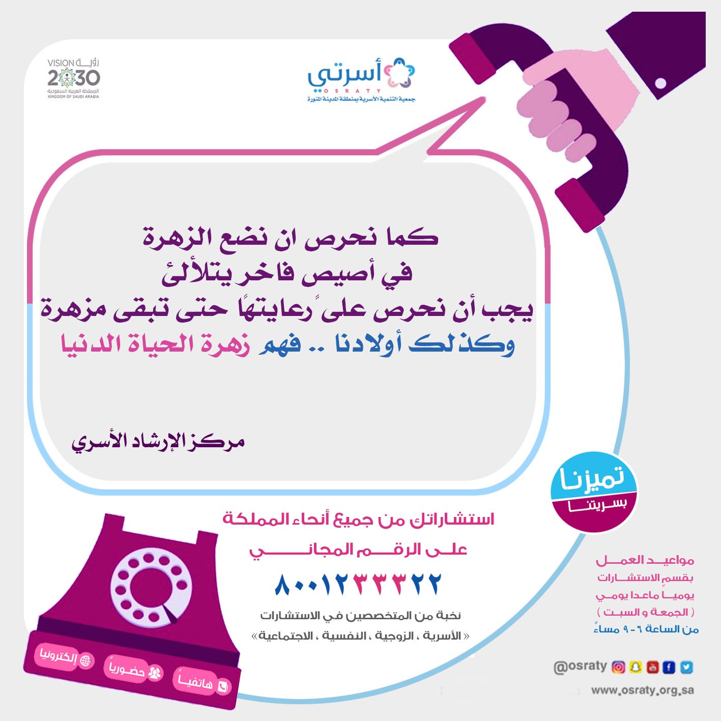 جمعية أسرتي Osraty على تويتر مركز الإرشاد الأسري أوقات العمل يوميا عدا الجمعة والسبت من 6 9 مساء هاتفيا 8001233322 حضوريا مقر الجمعية بشوران الكترونيا الموقع الإلكتروني لجمعية أسرتي المدينة المنورة Https T Co Kvzvo78irk