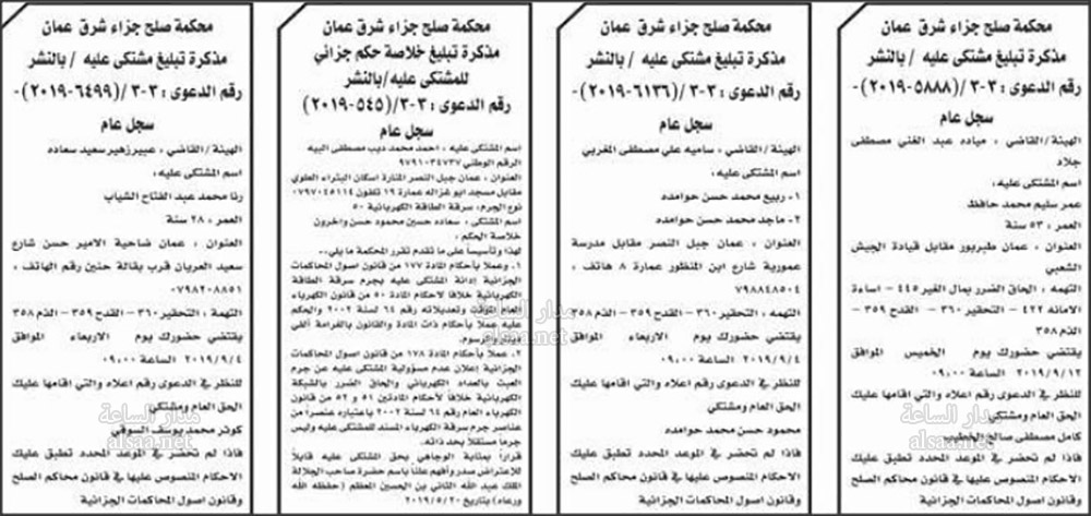 الاثنين أحكام قضائية وإخطارات عن دوائر التنفيذ ومذكرات تبليغ مواعيد جلسات أسماء