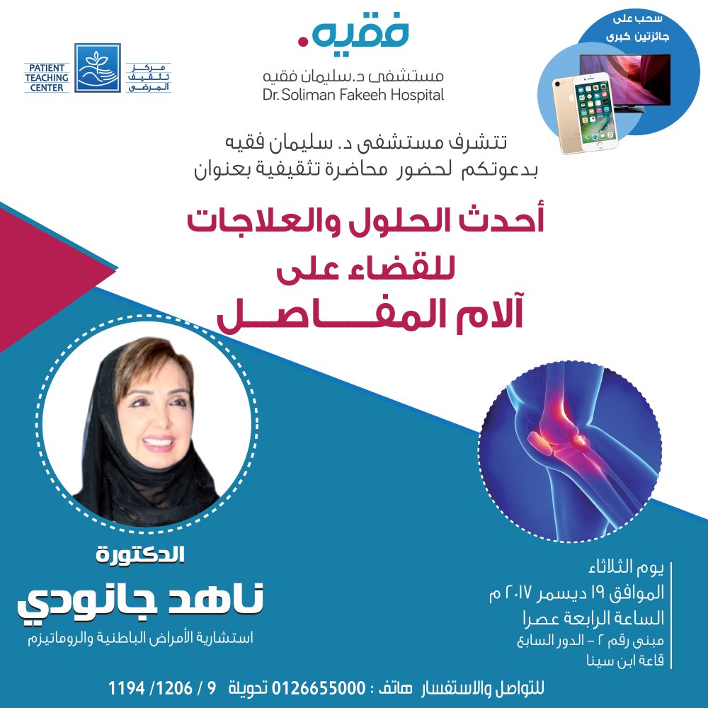 مستشفى د سليمان فقيه On Twitter شاركونا تتشرف مستشفى د سليمان فقيه بدعوتكم لحضور المحاضرة التثقيفيه بعنوان أحدث الحلول للقضاء على آلام المفاصل للدكتورة ناهد جانودي استشاريه الأمراض الباطنيه والروماتيزم التاريخ الثلاثاء ١٩