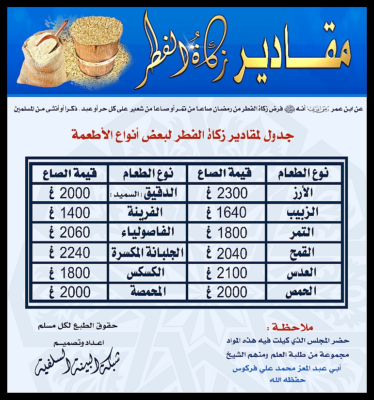 بطاقة مقادير زكاة الفطر