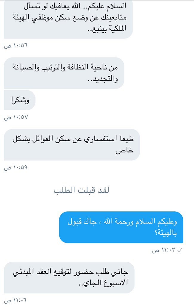 أصدقاء ينبع الصناعية على تويتر استفسار من شخص مقبل على الوظيفة عن وضع سكن موظفي الهيئة الملكية بـ ينبع من ناحية النظافة والصيانة والتجديد