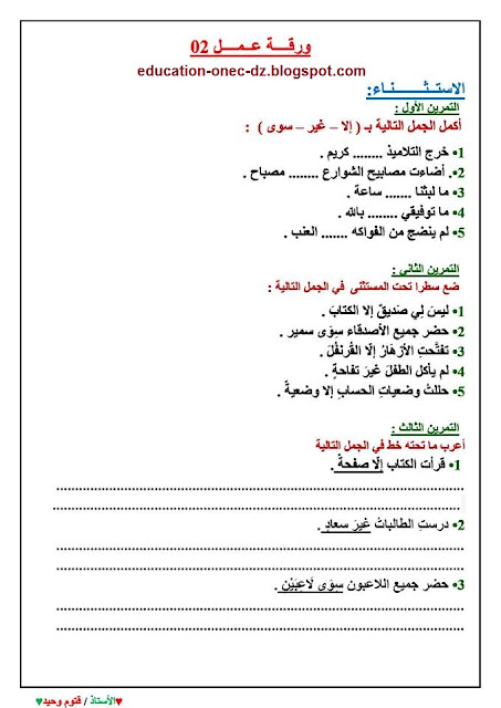 تمارين درس الاستثناء في مادة اللغة العربية للسنة الخامسة المكيفة مع الجيل الثاني