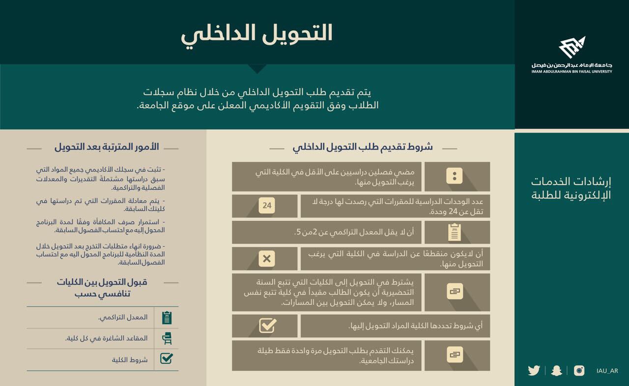 عمادة القبول والتسجيل على تويتر مواعيد وشروط التحويل الداخلي من داخل الجامعة الفصل الدراسي الثاني 1439 1438هــ يبدأ 1439 03 01هـ ينتهي 1439 03 12هـ مبادرة وعي جامعة الإمام عبد الرحمن بن فيصل Https T Co E1fhq1kkng